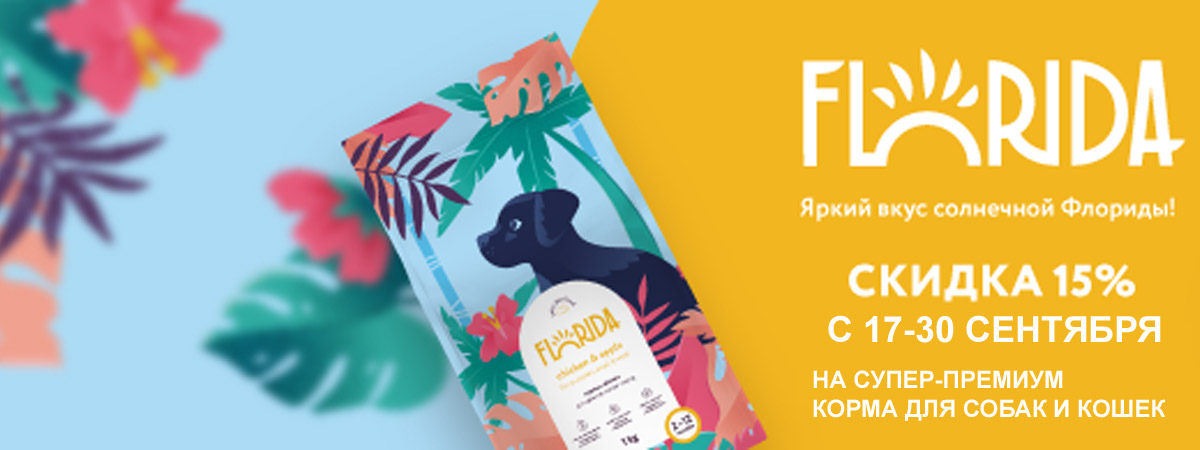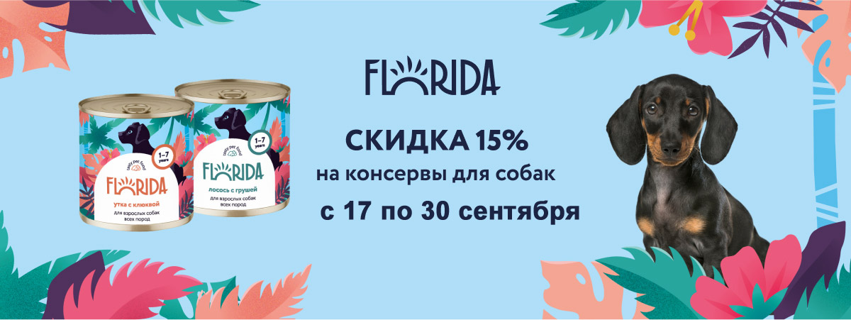 2 сентября 2025 будет действовать купон на скидку 15% на сухие корма FLORIDA для собак и кошек, и консервы для кошек и собак - код купона FLORIDA02SEP