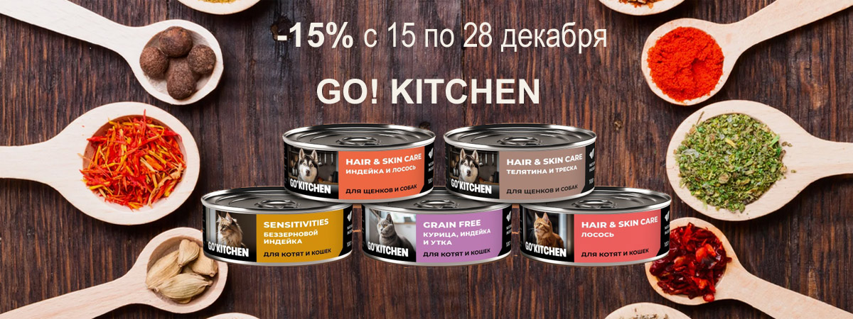 23 декабря 2025 будет действовать купон на скидку 15% на сухие корма GO'KITCHEN для собак и кошек, и консервы для кошек и собак - код купона GOKITCHEN23DEC