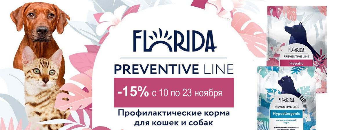 25 ноября 2025 будет действовать купон на скидку 15% на сухие корма FLORIDA для собак и кошек, и консервы для кошек и собак - код купона FLORIDA25NOV