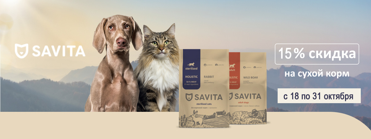 28 октября 2025 будет действовать купон на скидку 15% на сухие корма SAVITA для собак и кошек, и консервы для кошек и собак - код купона SAVITA28OCT